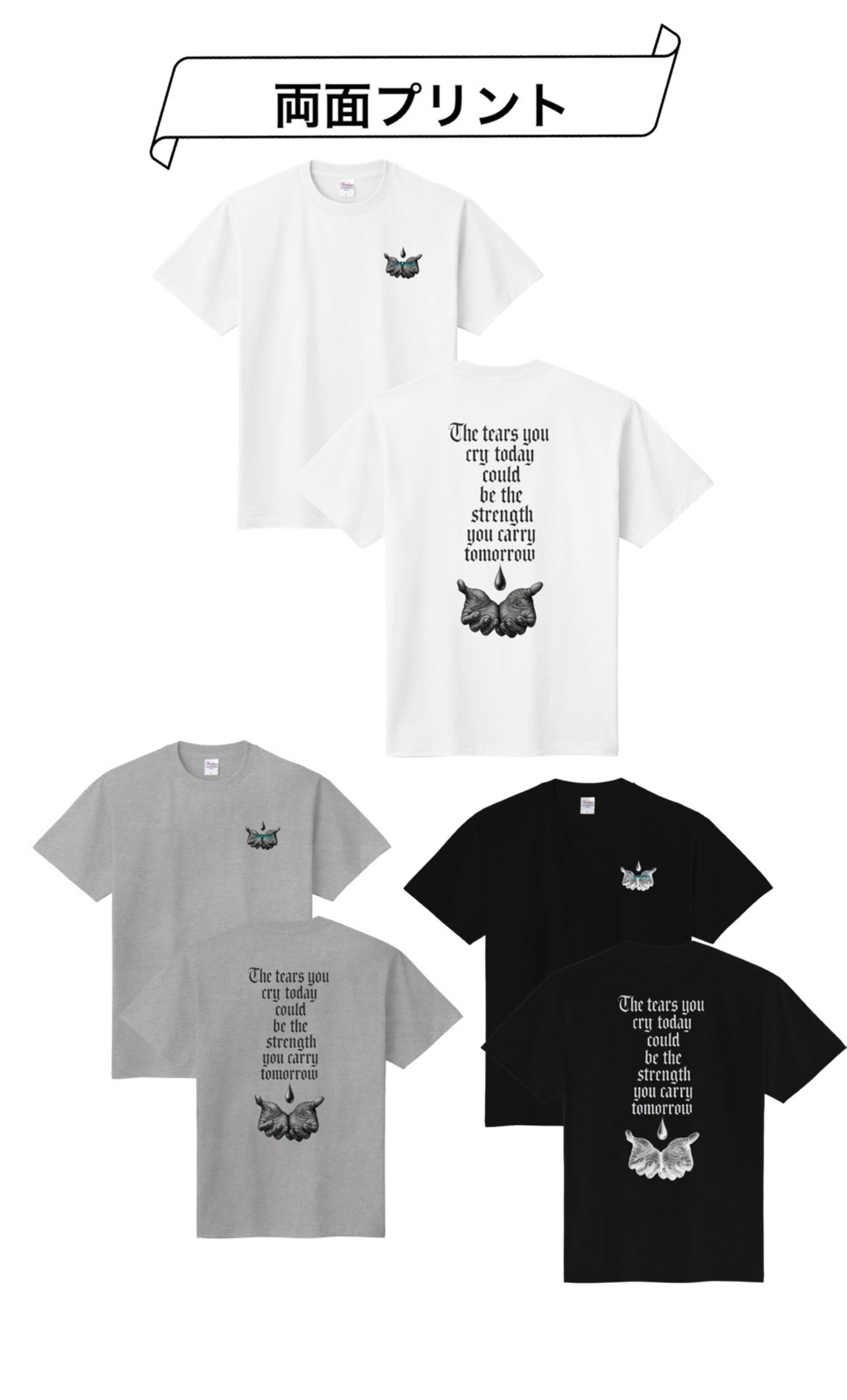 こちらの商品はフロント・デカプリ(3250円)、フロント・ワンポイント(3250円)、両面プリント(3250円+700円)からプリントサイズ、箇所を選んでいただけます。